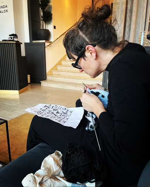 The workshops set out to perform the continuous history of embodied and inter-generational feminist practice of resistance through knitting in the face of fascism and contemporary coding and use of AI. The process is one of ”thread-becoming-surface and the biography of the knitter interweave with and imbue each other in a continuous process of joint growth” (Arantes 154). The ”moving hands, the gripping fingers and the feeling skin – jointly holding and guiding needles and yarn – the inspecting eyes, the imagining, anticipating, calculating and directing mind, the thread uncoiling from the ball of wool; all join in the profess of creating.”(154).