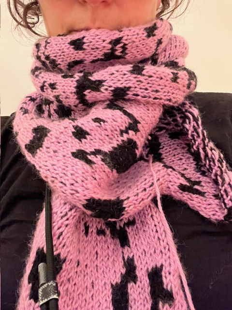 I have knitted Westerlund’s pattern in a few different variations: sample knits (an blanket project of knitting samples from around the world is in the making), a scarf, and a jumper (ongoing). The aim in knitting a variety of items is not to ”test” if the pattern actually responds to Haar Cascade algorithms or other facial recognition software. Rather, it is: