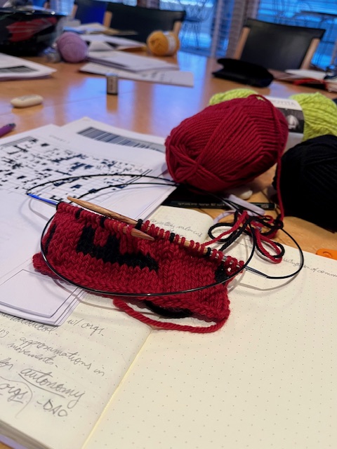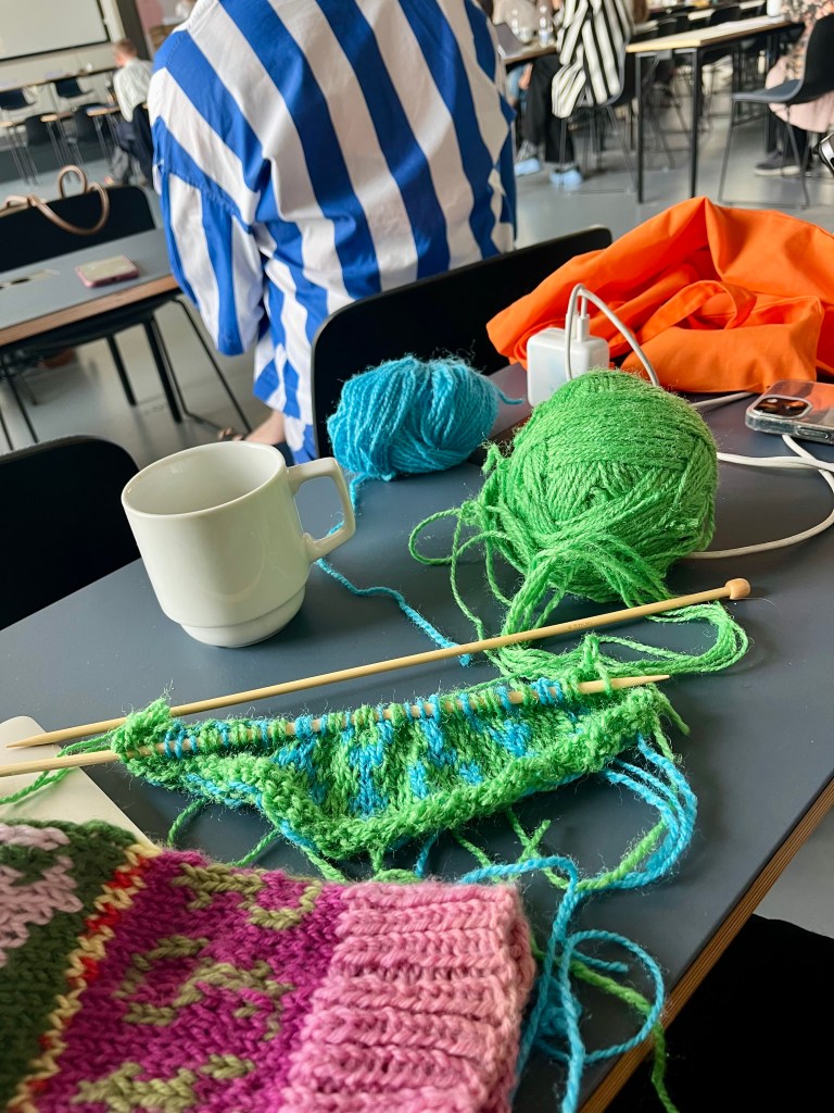 In a series of ”knit, code, resist”/”non-fascist living with AI and law” workshops – held in Gothenburg in 2022 (co-organized with Dr Rose Parfitt), in 2024 at the University of the Sunshine Coast, Australia (hosted by Dr Timothy Peters), and at La Trobe Law School, Melbourne, Australia (hosted by Dr Maria Elander), and at Newcastle Law School, UK, in 2025 – I have put knitting at the center, guiding workshop participants through a history of women’s knitting, of feminist theory and practice of knitting, code and embodied everyday resistance. All this while inviting workshop participants to knit, using yarns of different colors and qualities, and knitting needles provided for all (for non-knitters the balls of yarn have functioned as tactile ”de-stressing balls”). While interacting with the materials and with the provided knitting pattern (more on this below) as well as with each other – as participants’ pre-workshop knitting skills vary, and there is need to help each other out during the knitting – an intense focus and fluidity of inter-generational embodied practice, theory and method takes place as part of the workshop atmosphere.