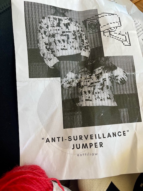 For the latter – feminist embodied resistance through everyday mundane practices – the project takes on and works with Ottilia Westerlund‘s knitting pattern ‘”Anti-surveillance jumper, a knit pattern that translate resistance to AI-powered everyday surveillance into knitwear. In doing so, it continues the history of women’s resistance to fascism through code-in-knitting during Wold War II. Westerlund does not make this reference herself in the knit pattern – the historical, political and social context is part of what my project and the ”Knit, code, resist/AI, law and non-fascist living” workshops brings to it.