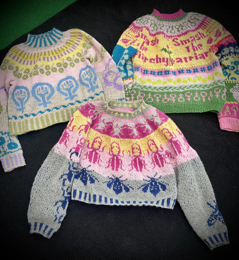 ”Smash the patriarchy” jumper (2025), ”Feminist sisterhood” jumper (2025), and ”Do I bug you” jumper (2025). Knit design @MatildaArvidsson